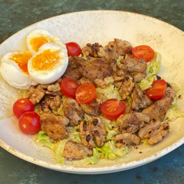 Mevsiminde toplanılan Akdeniz yeşillikleri, taze çiftlik yumurtası, avokado, cheddar peyniri ve kıtır soğanı ile balzemik soslu dana baconlu lezzet.