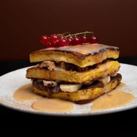 Yumurtalı ekmek arasında, nutella, fıstık ezmesi, muz, süt reçeli, tarçın, pudra şekeri ve taze kırmızı orman meyvelerinden oluşan 3 katlı lezzet şöleni.