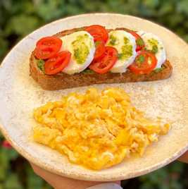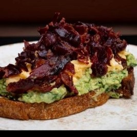 Kızartılmış ekşi mayalı ekmek üzerine avokado püresi, taze çiftlik yumurtası ve dana baconun verdiği enfes tat.