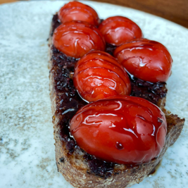 Kızartılmış ekşi mayalı ekmek üzerine avokadolu, zeytinyağlı, cherry domatesli lezzet.