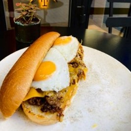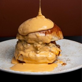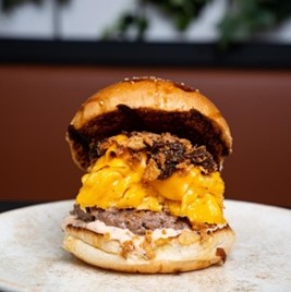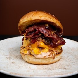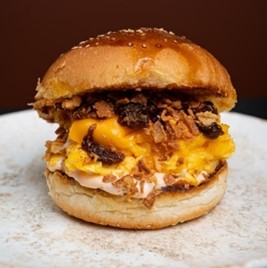 100 gramlık alevde ızgara köftesi, yumuşacık enfes Fransız brioche ekmeği, taze çiftlik yumurtası, cheddar peyniri, karamelize soğan, orijinal sosu ve soğan kıtırı ile et sever lezzet. Patates cipsi eşliğinde servis edilir.