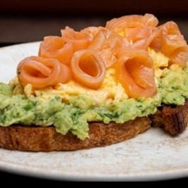 Kızartılmış ekşi mayalı ekmek üzerine avokado püresi, taze çiftlik yumurtası ve somon fümenin verdiği enfes his.